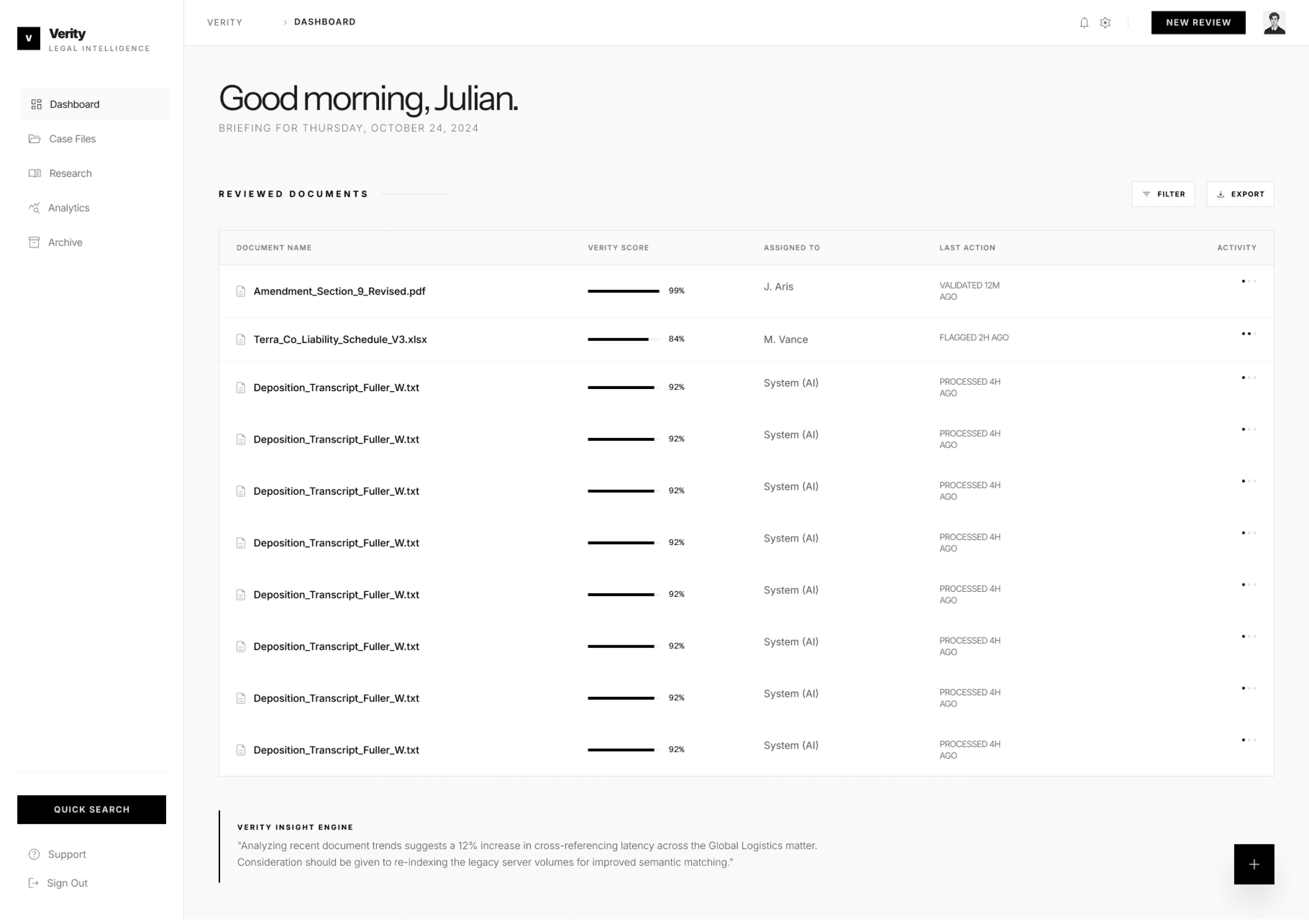 Verity exists to close that gap. By handling the review load with the precision of a seasoned associate, we free your attorneys to operate at the level they were trained for.